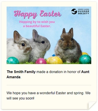 Here is a sample of the e-card that will be sent to your honoree when your donation is completed. Over 40 designs are available for holidays, memorials, birthdays, and lots more! You will supply the recipient's email address, then select your design, personalize your message, and decide whether or not to include the amount of your gift.