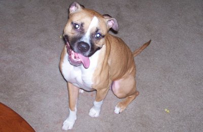 On August 19, 2006, my boyfriend Dan came into the shelter to adopt a puppy. When we saw Buddy, formerly known as Buster, we fell in love with him! He is either 2 or 3 years old, but no one knew because he was a stray. When he came home with us he was only 35 pounds, and he is now up to a healthy 48 pounds. He is a Boxer/Pit mix and is the most loving and affectionate dog we have ever had. He loves to run and play outside in the field. His favorite toy is still a soccer ball, which he carries around everywhere with him. He is like our child who we love dearly, and we know he loves us back.